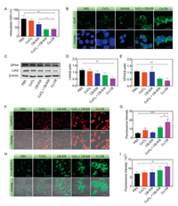| Fig. 3. The antitumor mechanism of Cu-CB. (A) The intracellular GSH content of 4T1 cells after treatment with PBS, CuCl2, CB-839, CuCl2 + CB-839 or Cu-CB (n = 3). (B) DLAT immunofluorescence staining of 4T1 cells after different drug treatments. Scale bar: 20 µm. (C) Western blot analysis of GPX4 and LIAS. Quantitative analysis of the expression of (D) LIAS and (E) GPX4 (n = 3). (F) The ROS production and (G) quantitative fluorescence analysis of 4T1 cells after different drug treatments (n = 3). CellROX was used as the probe. Scale bar: 50 µm. (H) The lipid peroxides production and (I) quantitative fluorescence analysis of 4T1 cells after different drug treatments (n = 3). C11-BODIPY was used as the probe. Scale bar: 20 µm. *P < 0.05, **P < 0.01, ***P < 0.001. The numerical results were presented as means ± SD. | |