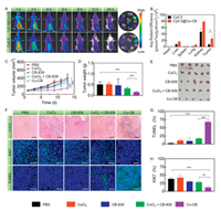 In this work, all the animal experiments were followed the guidelines of Institutional Animal Care and Use Committee (IACUC) of Animal Experiment Center of Guangzhou Medical University (GY2024–242). To evaluate the therapeutic potential of Cu-CB in vivo, its biodistribution was assessed using 4T1 tumor-bearing mice. Mice were administered with Cy5.5-labeled Cu-CB (Cy5.5@Cu-CB) via intravenous injection, and fluorescence imaging was performed at specified time points. As shown in Fig. 4A, the overall fluorescence signal decreased over time in both the two groups, but the signal at the tumor site notably increased only in the group of Cy5.5@Cu-CB. This observation was corroborated by ex vivo fluorescence imaging, which revealed that tumor tissues from Cy5.5@Cu-CB-treated mice exhibited significantly stronger fluorescence compared to those from Cy5.5-treated mice. Specifically, the fluorescence intensity in tumor tissues of the Cy5.5@Cu-CB group was 3.46-fold higher than that in the Cy5.5 group (Fig. 4B), demonstrating the effective passive targeting capability of Cy5.5@Cu-CB.