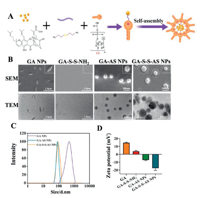 | Fig. 1. (A) Preparation process of GA-S-S-AS NPs. (B) SEM and TEM images of GA NPs, GA-S-S-NH2, GA-AS NPs, and GA-S-S-AS NPs. (C) Particle sizes of GA NPs, GA-AS NPs and GA-S-S-AS NPs. (D) Zeta potentials of GA NPs, GA-S-S-NH2, GA-AS NPs and GA-S-S-AS NPs. Data are presented as mean ± standard deviation (SD) (n = 3). | |
