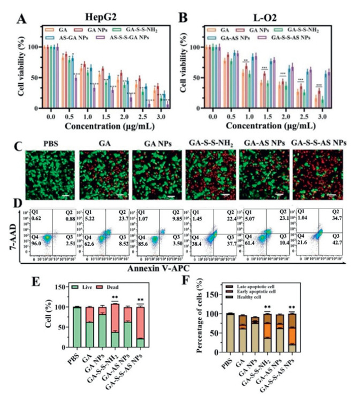 | Fig. 2. Cytotoxicity of HepG2 cells (A) and L-O2 cells (B) exposed to different concentrations of treatment groups (GA dose was 0, 0.5, 1, 1.5, 2, 3 µg/mL) for 24 h. (C) Staining analysis images of live/dead cells in different treatment groups (scale bar: 100 µm). (D) Apoptosis of HepG2 cells induced by different treatment groups analyzed by flow cytometer. (E) Quantitative staining results of live/dead cells in different treatment groups. (F) Percentage of apoptotic cells including early and late-stage apoptotic cells in different groups. Values represented were means ± SD (n = 5). P < 0.05, **P < 0.01, ***P < 0.001. | |