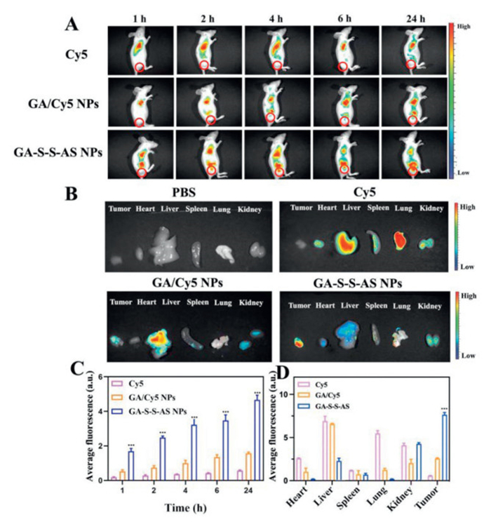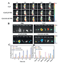 | Fig. 3. (A) Fluorescence pictures of HepG2 tumor-bearing mice taken at various intervals following intravenous injections of GA/Cy5 NPs, GA-S-S-AS NPs, and Cy5. (B) Fluorescence pictures captured in vitro 24 h after injection of main organs and tumors that were removed. (C) Quantitative evaluation of the average Cy5 fluorescence intensity in tumors at various in vivo time intervals. (D) Twenty-four hours after injection, the average fluorescence intensity of the tumors and organs visible in ex vivo imaging. Values represented were means ± SD (n = 4). ***P < 0.001. | |