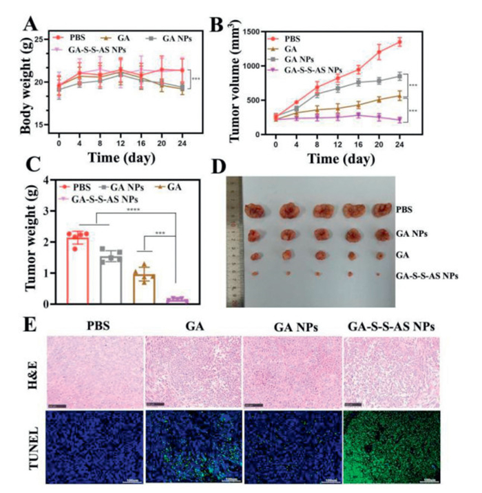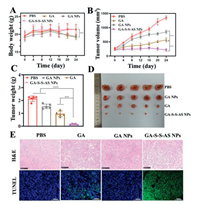 | Fig. 4. (A) Changes in body weight of mice in different treatment groups. (B) Tumor growth curves of mice treated with different groups (4 mg/kg GA). The therapeutic terminal's tumor weight (C) and photo of the tumors removed from the mice (D). (E) TUNEL and H&E staining of the tumor tissues that were extracted from various groups. Scale bar: 100 µm. The data is shown as mean ± SD (n = 6). ***P < 0.001, ****P < 0.0001. | |