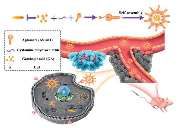 Herein, we introduce a novel finding that hydrophobic GA can undergo self-assembly into NPs with specific structures through one-step nanoprecipitation in an aqueous medium. Unlike the improved therapeutic outcomes seen with the self-assembly of other monomeric drugs, the therapeutic effectiveness of GA post self-assembly is determined to be suboptimal in comparison to the equivalent free drug. According to the aforementioned results, a multifunctional carrier-free nanodrug was formulated in the current study, offering benefits such as straightforward preparation, high drug loading capacity, active targeting of tumor, as well as tumor microenvironment responsiveness. Specifically, the anticancer drug GA was utilized to establish a connection with the aptamer (AS) via a disulfide bond, resulting in the formation of nanodrugs GA-S-S-AS NPs through self-assembly. This approach maintains nano-size delivery, inhibits the self-assembly of pure drugs, and enhances the antitumor efficacy (Scheme 1). The aptamers incorporated in the nanodrugs provide both stability and specificity by targeting nucleolin receptors overexpressed on liver cancer cells [43–45]. The introduction of disulfide bonds disrupted the self-assembly properties of GA, enabling GA-S-S-AS NPs to react to elevated levels of glutathione in the tumor site, leading to the liberation of free GA. The negative charge of GA-S-S-AS NPs, attributed to the external aptamer, significantly enhances the circulation duration of the drug delivery system and the accumulation of the nanodrug within the tumor. Furthermore, the incorporation of Cy5 into the aptamer facilitates convenient visualization of the nanodrugs both in vitro and in vivo. Collectively, the findings demonstrate that the GA-S-S-AS NPs exhibit targeted tumor localization, effective internalization, robust fluorescence imaging capabilities, and notable antitumor efficacy. In summary, this research effectively addresses the issue of diminished efficacy resulting from the self-assembly of hydrophobic drugs in aqueous environments, enhances the antitumor potency of such drugs, and establishes a basis for further exploration of novel formulations for hydrophobic antitumor drugs.