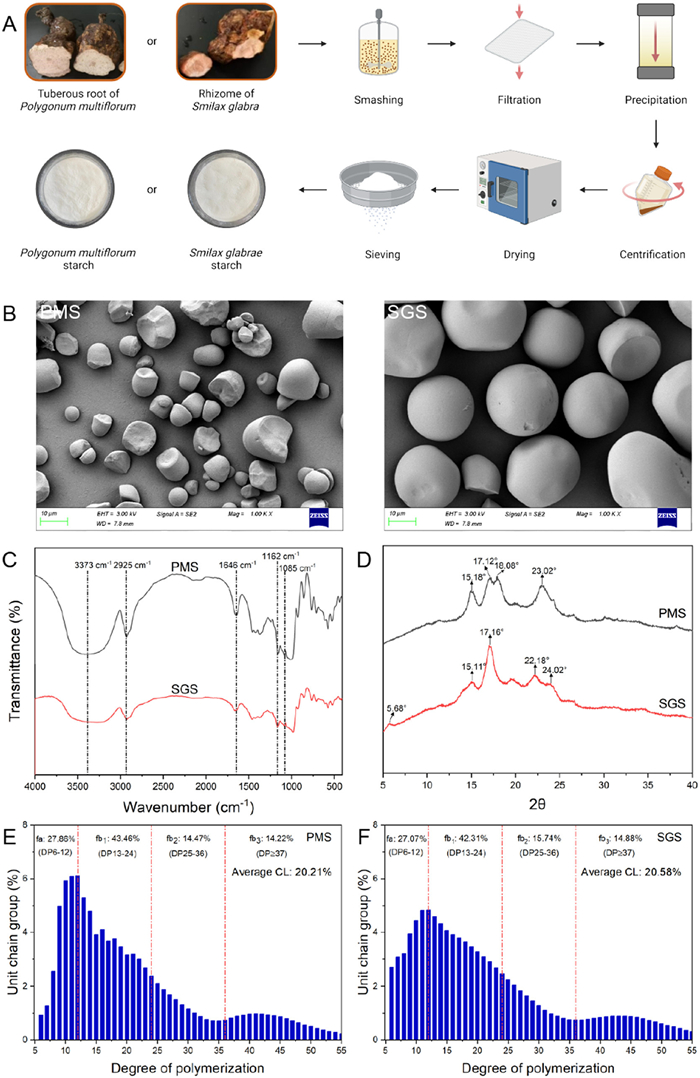 Polygonum multiflorum is well-known for its broad pharmacological activities, including anti-aging, antioxidant, and neuroprotective effects [5]. Similarly, Smilax glabra tubers, traditionally used for their anti-inflammatory and antioxidant properties, serve as rich starch reservoirs [6]. Emerging evidence suggests that starches derived from these medicinal plants may possess unique functional characteristics, setting them apart from conventional starches. These starches may be particularly enriched with bioactive components, such as soluble dietary fiber and RS, which could further enhance their health benefits. Therefore, systematically investigating the particle property-function relationships of Polygonum multiflorum starch (PMS) and Smilax glabra starch (SGS) is crucial for understanding their potential as functional ingredients in various applications.