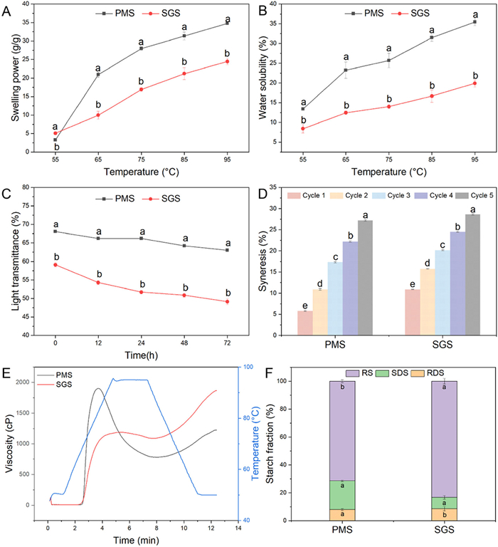 | Fig. 2. The SP (A), WS (B), light transmittance (C), and syneresis (D) Pasting properties (E) and in vitro digestibility (F) of PMS and SGS. | |