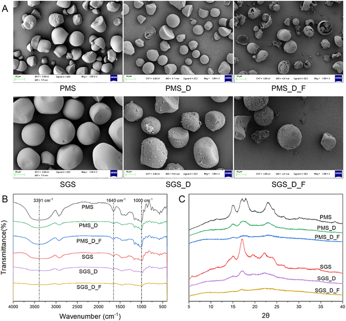 | Fig. 3. Structural evolution of PMS and SGS during in vitro digestion-fermentation: (A) SEM images at 1000×, (B) FT-IR, and (C) XRD. | |