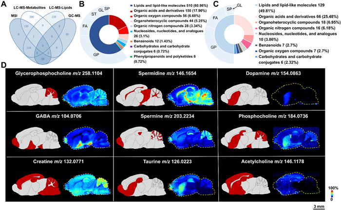 For high-resolution imaging studies, four distinct brain slices were prepared to generate a spatial metabolic profile of the mouse brain. Nissl staining (Fig. S4A in Supporting information) revealed 21 microregions in the brain, including the cerebral cortex (CTX), olfactory bulb (OB), corpus callosum (CC), striatum (STR), hippocampus (HP), dentate gyrus (DG), thalamus (TL), hypothalamus (HT), midbrain (MB), substantia nigra (SN), pons (PO), medulla (MD), cerebellar gray matter (CBG), cerebellar white matter (CBW), cerebellar granular layer (CGL), and others. A total of 838 metabolites were identified after we characterized the mouse brain tissues using three platforms-LC-MS lipidomics, LC-MS metabolomics, and GC–MS to get accurate metabolite information (Fig. 2A). MS/MS spectra of representative metabolites are in Fig. S5 (Supporting information). Identification results are shown in Table S1 (Supporting information). Complex lipids, including fatty acyls (FA), glycerolipids (GL), glycerophospholipids (GP), sphingolipids (SP), and sterol lipids (ST), make up the majority of the brain metabolome, according to the results (Fig. 2B). In the brain, lipids and lipid-like molecules constituted the largest category of detected metabolites, followed by organic acids and their derivatives, which included amino acids, modified amino acids, peptides, and hydroxy acids. A comparison with the MSI data identified 259 metabolites, classified as shown in Fig. 2C. Sterol lipids, phenylpropanoids and polyketides were not detected in AFADESI, likely due to their lack of polarity.
