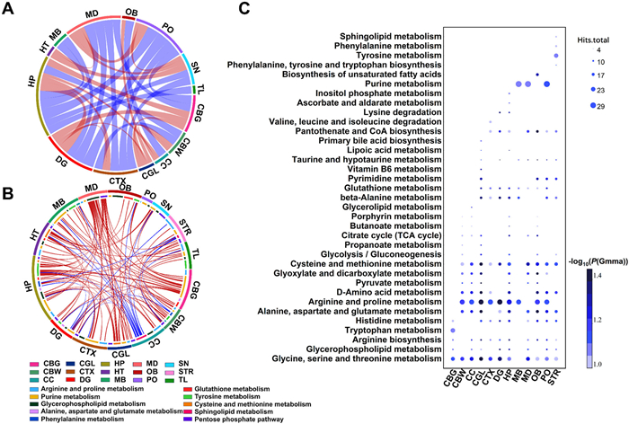| Fig. 3. Metabolic correlation and differential analysis between brain regions. (A) Correlation circos plot of different brain regions. (B) Metabolite-metabolite correlation circos plot of different brain regions. (C) Bubble plot of differential pathways in different brain regions. | |