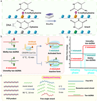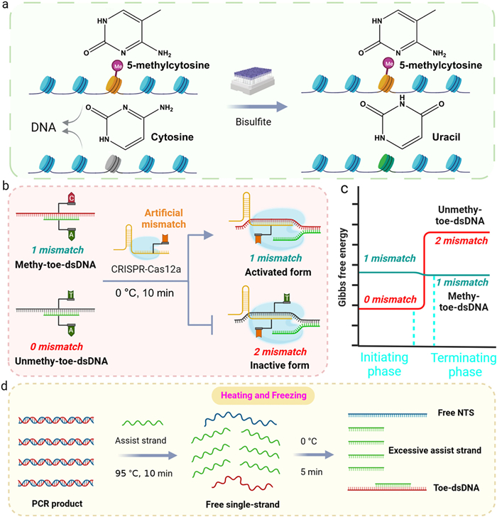 | Fig. 1. Principle of PAM-free CRISPR-Cas12a hyper-sensitive DNA methylation detection method in this work. (a) Mechanism of bisulfite conversion for methylated and unmethylated DNA. (b) Principle of introducing an assist-strand and designing an artificial mismatch to improve CRISPR-Cas12a's specificity. (c) ΔG of the strand displacement reaction between methy-toe-dsDNA/unmethy-toe-dsDNA and CRISPR-Cas12a. (d) Process of "heating and freezing". | |