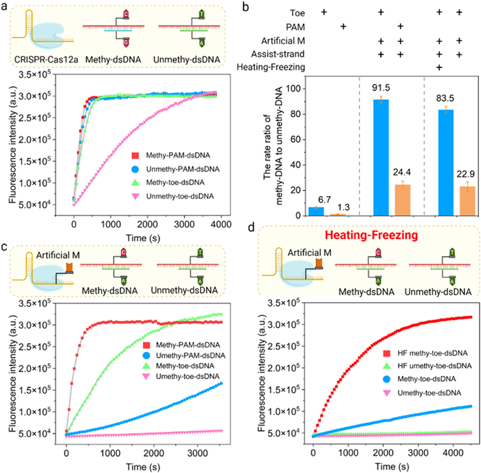 Then, rapidly cool to 0 ℃, due to the ssDNA strands are too long, its recovery kinetics to form dsDNA is inhibited at 0 ℃. However, the assisted-strand is short and its concentration is far higher than that of the long ssDNA strand, so it can quickly bind to the long ssDNA strand at 0 ℃ to form toe-dsDNA. Interestingly, CRISPR-Cas12a can also bind to Toe-dsDNA and activate its trans-cleavage activity under low temperature conditions [41]. Through the reaction principle, we can see that toe-dsDNA activates CRISPR-Cas12a without the limitation of PAM sequence and improves the specificity of its methylation recognition. More importantly, by constructing toe-dsDNA of any sequence through the "heating and freezing" method, it greatly broadens the application range of CRISPR-Cas12a in DNA methylation detection.