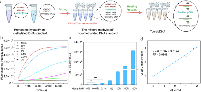 | Fig. 4. Analysis of sensitivity and specificity of this method for DNA methylation detection. (a) Schematic diagram of our method to detect mixed samples of different proportions. (b) Fluorescence curve of four methylation sites in ACP methylated standard detecting by our method. (c) Statistical analysis of four methylation sites in ACP methylated DNA standard. (d) Relationship between the rise rate of the fluorescence intensity and the concentration of ACP. LgΔFL intensity means the logarithm of the rise rate of the fluorescence intensity. LgC means the logarithm of target concentration. Student's t-tests. ns, P > 0.05; *, P < 0.05; **, P < 0.01; ***, P < 0.001. n = 3. | |