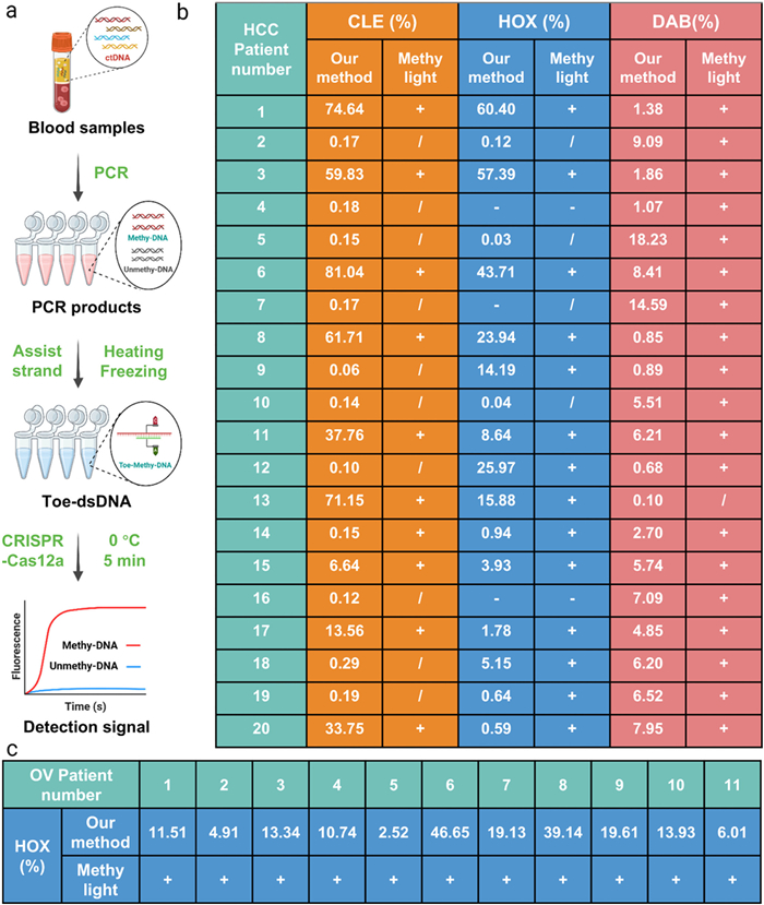 To evaluate the potential applications of our method in clinical sample detection, we collected serum samples from 11 ovarian cancers and 29 HCCs and performed test using this method. The study was approved by the Ethics Committee of Tongji Medical College, Huazhong University of Science and Technology: No. [2022] IEC (A131). We selected DAB, HOX and CLE as the targets for HCC and HOX for ovarian cancer. The actual sample detection process was shown in Fig. 5a: First, we extracted circulating DNA from the serum and performed conversion with bisulfite (100 ng in total); next, we used the previously mentioned primers to amplify ACP-1, HOX and CLE, obtaining the amplified PCR products, respectively; then, we performed "heating and freezing" treatment on the PCR products; finally, we added CRISPR-Cas12a at 0 ℃ for 10 min and then detected the fluorescent signal. Then, we calculated the methylation percentage of clinical samples by standard curves. The test results showed our method detected methylation abundance ranging from 0.03% to 78.03% in clinical samples (Figs. 5b and c, and Fig. S21 in Supporting information). In addition, we collected leukocyte samples from 4 healthy people (approved No. [2022] IEC (A131)). As was shown in Fig. S22 (Supporting information), the methylation level of the 4 healthy people was 0% in the leukocyte. To verify the accuracy of the method, we used the Methylight to test the above samples, the results showed that the detection results of our method were consistent with the Methylight (Figs. 5b and c, and Fig. S21 in Supporting information). It should be noted that due to the limited sensitivity of the Methylight method, it cannot detect low abundance methylation levels. Compared with Methylight, our method has excellent feasibility, stability and reliability in clinical applications, fully demonstrating its clinical application value.
