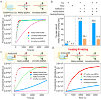 | Fig. 2. Establishment and verification of the principle of our method. (a) Fluorescence curve of CRISPR-Cas12a for the single CpG methylation site in toe-dsDNA and conventional dsDNA with PAM. (b) Discrimination factor of CRISPR-Cas12a for the single CpG methylation site in toe-dsDNA and conventional dsDNA with PAM. Discrimination factor means the rate ratio of methy-toe-dsDNA and unmethy-toe-dsDNA. (c) Fluorescence curve for the single CpG methylation site using artificial mismatch and assist-strand. (d) Fluorescence curve for the single CpG methylation site by "heating and freezing". HF means heating and freezing. Reaction setup: 100 nmol/L methy-toe-dsDNA and unmethy-toe-dsDNA, 1000 nmol/L assist-strand, 20 nmol/L LbCas12a, 10 nmol/L crRNA, 200 nmol/L ssDNA FQ probe. n = 3. | |
