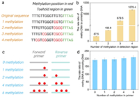 | Fig. 3. Conditional optimization of our method. (a) Sequences of the methy-toe-dsDNA. The methylation positions are marked in red and toehold region in green. (b) Discrimination factor for the single methylation site between methy-toe-dsDNA and unmethy-toe-dsDNA. (c) Methylation positions and numbers in FP and RP of ACP. The methylation positions are marked in red. (d) Discrimination factor for the single methylation site using different primers. Reaction setup: 100 nmol/L toe-dsDNA or PCR products, 1000 nmol/L assist-strand, 20 nmol/L LbCas12a, 10 nmol/L gRNA, 200 nmol/L ssDNA FQ probe. n = 3. | |