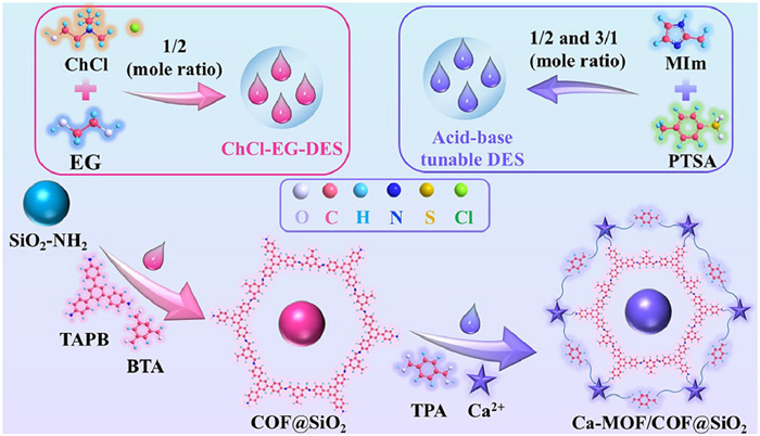In this work, an acid-base tunable DES was applied for the green synthesis of Ca-MOF/COF@SiO2. Firstly, COF@SiO2 was prepared in a choline chloride (ChCl)/ethylene glycol (EG) based DES. Secondly, acidic and basic DESs were synthesized using PTSA and MIm in mole ratios of 2/1 and 1/3, respectively. Finally, calcium metal was added to acidic DES to form a metal/oxygen-containing organic acid framework, which was rapidly assembled with terephthalic acid (TPA) dissolved in basic DES to form Ca-MOF/COF@SiO2 (Fig. 1). The Ca-MOF/COF@SiO2 combines the excellent chromatographic separation ability of COF and MOF as well as has excellent stability. Meanwhile, the combination of COF and MOF balances the hydrophilicity and hydrophobicity of Ca-MOF/COF@SiO2, which can be used to identify and separate multiple types of analytes. Various retention mechanisms were explored and thermodynamic study was conducted.