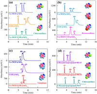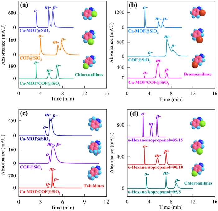 | Fig. 2. (a-c) Chromatographic separation of positional isomers on different columns. Eluent: n-hexane/isopropanol = 90/10. (d) Chromatographic separation of chloroanilines on the Ca-MOF/COF@SiO2 column at different eluents. | |