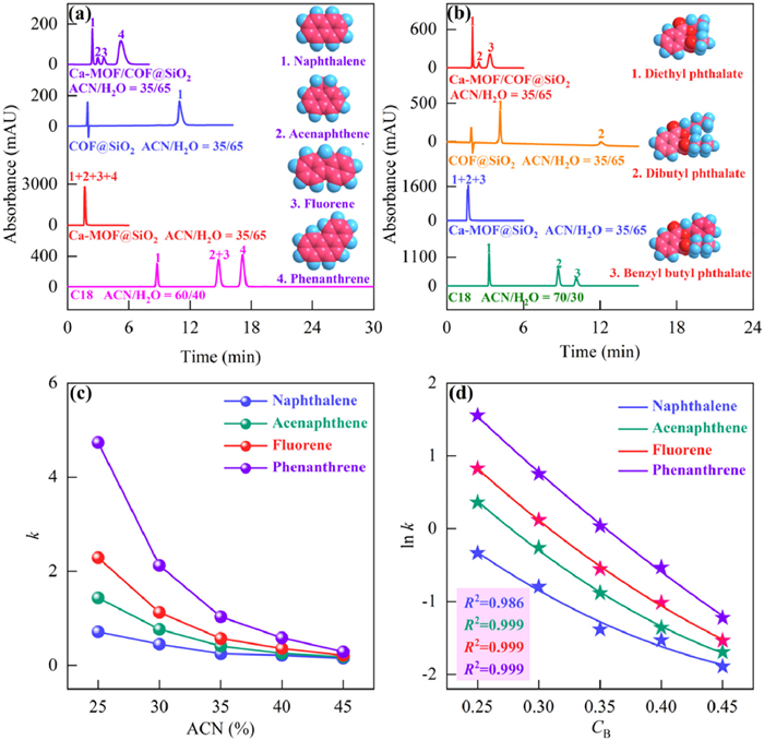 | Fig. 3. Chromatographic separation of PAHs (a) and PEs (b) on different columns. (c) Plots of k vs. ACN content for PAHs. (d) Plots of ln k vs. the volume fraction of organic phase (CB) for PAHs. | |