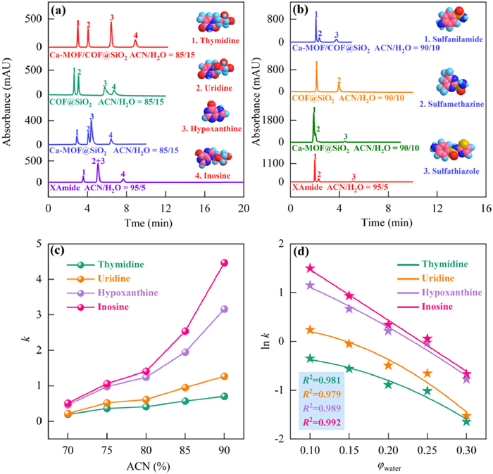 The baseline separation of four nucleosides/bases (NBs) and three sulfonamides (SAs) can be achieved on the Ca-MOF/COF@SiO2 (Figs. 4a and b). Four NBs were separated for nine times in a row on the Ca-MOF/COF@SiO2 column, and the RSDs for the retention time of four NBs range from 0.5% to 1.0% (Fig. S7 in Supporting information), which displays an awesome separation reproducibility. There has been a significant improvement in separation ability of Ca-MOF/COF@SiO2 compared to COF@SiO2 and Ca-MOF@SiO2, illustrating the advantages of the composite material. The combined action of Ca-MOF and COF facilitates a more efficient hydrophilic separation of polar analytes on the Ca-MOF/COF@SiO2. The highest column efficiency and maximum resolution for NBs are 54307 plates/m and 12.38, respectively (Table S9 in Supporting information). Chromatographic separations of NBs and SAs were also performed using the commercialized XAmide column. The Ca-MOF/COF@SiO2 is observed to be more capable of separating the four NBs than the XAmide column (Figs. 4a and b). In addition, unlike the Ca-MOF/COF@SiO2, the XAmide column needs to use more ACN in the eluent to achieve a comparable separation of the three SAs.