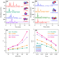 | Fig. 4. Chromatographic separation of NBs (a) and SAs (b) on different columns. (c) Plots of k vs. ACN content for NBs. (d) Plots of ln k vs. the volume fraction of water (φwater) for NBs. | |