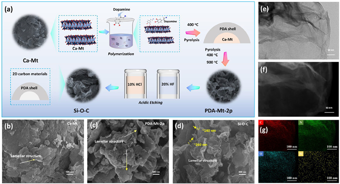 | Fig. 1. (a) The preparation process of PDA-Mt-2p and Si-O-C. SEM image of (b) Ca-Mt, (c) PDA-Mt-2p, (d) Si-O-C. (e) TEM of Si-O-C. (f) HAADF-STEM of Si-O-C. (g) TEM mappings of Si-O-C. | |