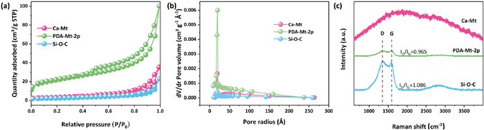 | Fig. 2. (a) N2 adsorption–desorption isotherms, (b) pore size distribution and (c) Raman spectra of Ca-Mt, PDA-Mt-2p and Si-O-C. | |