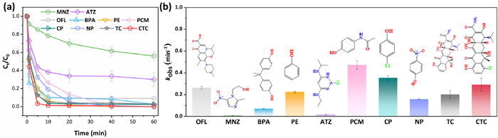| Fig. 3. (a) Degradation of different contaminants in the Si-O-C/PMS system with 2.0 mmol/L PMS. (b) The kobs of different contaminants degradation. Catalyst dosage: 0.1 g/L; PMS dosage: 2.0 mmol/L; Pollutant concentration: 10 mg/L. | |
