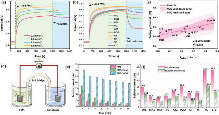 | Fig. 5. Different falling potential trends after adding PMS dosage (a) and different pollutants (b). (c) Correlation between kobs of different pollutants and their falling potentials obtained in the Si-O-C/PMS system. (d) A scheme of galvanic oxidation system. (e) Current generation in GOS coating with different catalysts (Ca-Mt and Si-O-C). (f) Current generation in GOS coating with different pollutants. | |