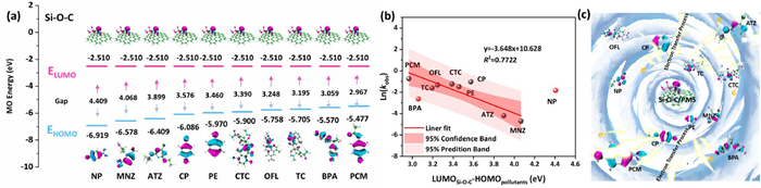 | Fig. 6. (a) The LUMO (Si-O-C/PMS complexes) and HOMO pollutants. (b) The correction between the calculated gaps and lnkobs data of pollutants. (c) Various organic pollutants degraded by Si-O-C/PMS via electron transfer process. | |
