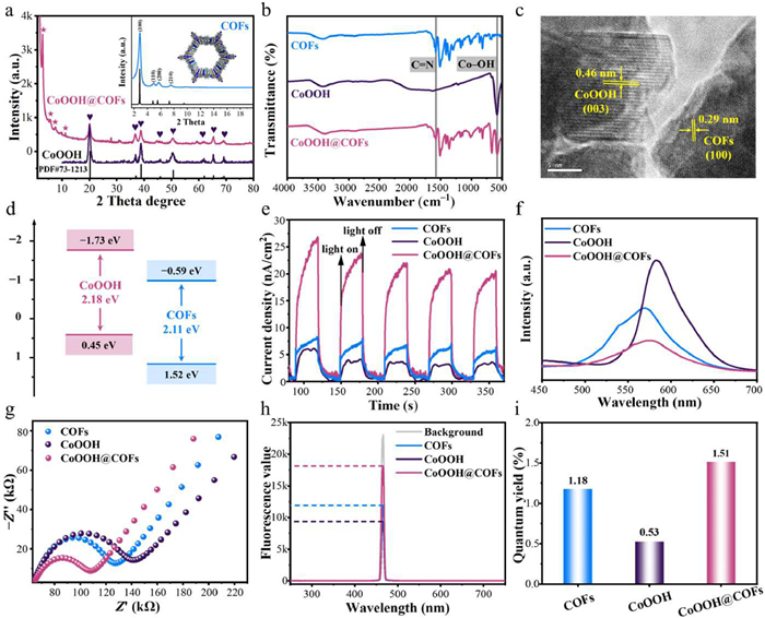 | Fig. 2. Physic-chemical characterization of the COFs, CoOOH, and CoOOH@COFs: (a) XRD, (b) FTIR, and (c) HRTEM images. Photo-electro-chemical characterization of the COFs, CoOOH, and CoOOH@COFs: (d) band alignment, (e) TPR, (f) PL, (g) EIS spectra, (h) in-situ QY in the photocatalytic-PMS activation system and dark conditions, and (i) QY. | |