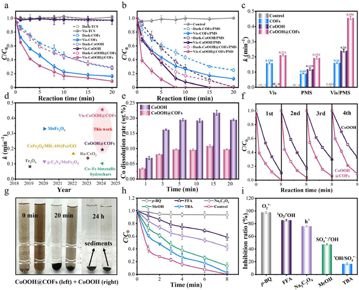 | Fig. 3. The catalytic performance of the COFs, CoOOH, and CoOOH@COFs in (a) visible light photocatalytic system, (b) PMS catalytic oxidation system, and the synergistic system of photocatalytic-PMS activation. (c) The reaction rate constant k of the TCS degradation in the systems. (d) Comparison of the previously reported kinetic rate constants of TCS degradation with this work. (e) The ratio of the mass of Co ions in the solution to the total mass of Co element and (f) TCS degradation efficiency after successive four cycles in the Vis-CoOOH/PMS and Vis-CoOOH@COFs/PMS systems. (g) Gravity separation (i.e., settling) of CoOOH@COFs and CoOOH. (h) The degradation efficiency and (i) inhibition rate of TCS degradation with different quenchers in the Vis-CoOOH@COFs/PMS system. Conditions: [TCS] = 10 mg/L, [Catalysts] = 0.2 g/L, [PMS] = 0.7 mmol/L, [MeOH] = [TBA] = [p-BQ] = [KBrO3] = [Na2C2O4] = [FFA] = 70 mmol/L, initial pH 6, T = 20 ± 1 ℃. | |
