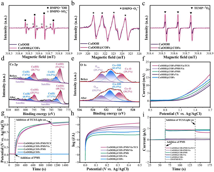 | Fig. 4. The ESR spectra of (a) DMPO−•OH and DMPO−SO4•–, (b) DMPO−O2•− and (c) TEMP−1O2 adducts in the Vis-CoOOH/PMS and Vis-CoOOH@COFs/PMS systems. High-resolution XPS spectra of CoOOH@COFs before and after the catalytic oxidation process: (d) Co 2p and (e) O 1s. (f) The LSV plots, (g) chronopotentiometry curves, (h) Tafel polarization curves, and (i) amperometric i-t curve measurements upon the addition of PMS and TCS or switching on the visible light using CoOOH@COFs and indium tin oxides (ITO) as the working electrode. Conditions: [TCS] = 10 mg/L, [Catalysts] = 0.2 g/L, [PMS] = 0.7 mmol/L, [Na2SO4] = 0.2 mol/L, T = 20 ± 1 ℃. | |