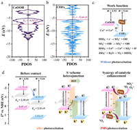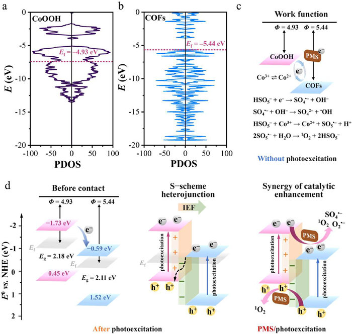 | Fig. 5. (a, b) The partial density of states (PDOS) diagrams of CoOOH and COFs. (c) Schematic diagram of PMS activation mechanism by CoOOH@COFs transition metal and (d) CoOOH@COFs S−scheme heterojunction with interface electric field. | |