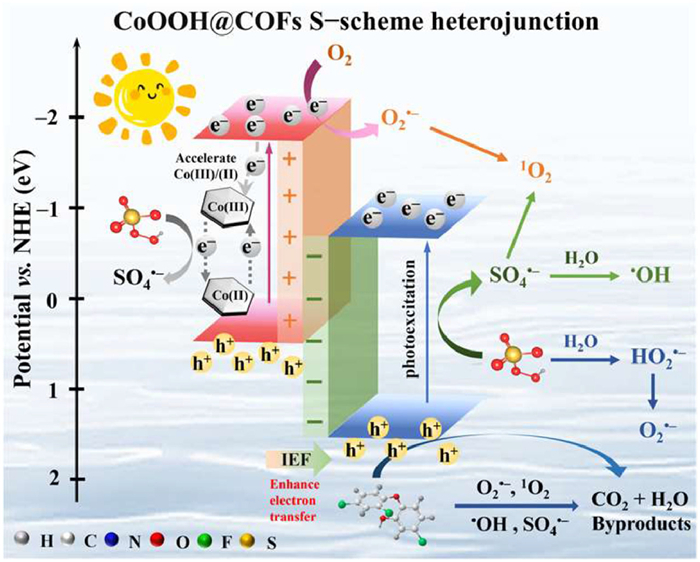 In summary, a novel CoOOH@COFs S−scheme heterojunction was elaborately constructed applying for efficient TCS degradation. Specifically, in the photocatalytic-PMS activation system, CoOOH@COFs completely degraded TCS within 8 min with a reaction rate constant of 1.90 times that of CoOOH. The photogenerated electrons facilitated the Co(Ⅲ)/Co(Ⅱ) redox cycle and reacted with PMS to decrease the charge combination. Meanwhile, S−scheme heterojunction greatly promoted photogenerated carrier separation, enhanced interfacial electron transfer, extended charge lifetime, and accelerated PMS activation to generate abundant ROSs. Importantly, both radicals (O2•−, •OH, and SO4•−) and non-radicals (1O2, h+, and e−) were involved in the Vis-CoOOH@COFs/PMS system, in which O2•− was the dominant ROSs in TCS degradation. Besides, the degradation intermediates had lower toxicity than TCS, indicating that CoOOH@COFs was an environmentally friendly photocatalyst. This study provides a theoretical basis and comprehensive reference for the synergetic mechanism of photocatalytic-PMS activation by S−scheme heterojunction photocatalysts for refractory organic pollutants in water environments.