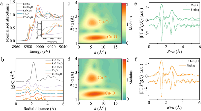 | Fig. 2. X-ray fine structure analysis. (a) Normalized Cu K-edge XANES spectra. (b) k3-weighted Fourier transform EXAFS spectra without phase correction. Cu K-edge WT-EXAFS contour plots of (c) Cu2O and (d) CO–Cu2O. Fitting of k space and R space of Cu in (e) Cu2O and (f) CO–Cu2O. | |