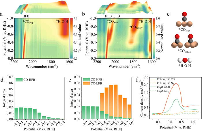| Fig. 3. In situ monitoring of adsorbed *CO species. In situ ATR-SEIRAS spectra of (a) Cu2O and (b) CO–Cu2O during timed current scans from 0 V to −1.0 V vs. RHE. (c) The adsorption behavior of species within 2200–1600 cm−1 ranges, with Cu, O, C, and H represented by orange, red, gray, and white, respectively. The integrated area of *COatop for (d) Cu2O and (e) CO–Cu2O at various wavenumbers is also shown. The experimental conditions included CO2-saturated 0.5 mol/L KHCO3 as the electrolyte. Peak positions were determined based on the maximum intensity of the CO stretching band. (f) Electrochemical CO stripping voltammetry curves of Cu2O and CO–Cu2O in saturated N2 or CO atmospheres. | |