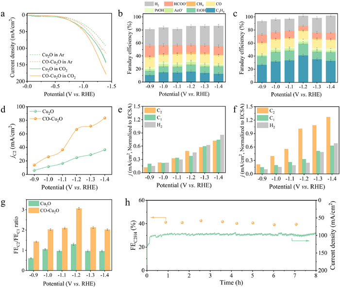 | Fig. 4. CO2-to-C2 electroreduction performance. (a) Comparison of LSV for CO2 and Ar-saturated electrolytes. Faradaic efficiency of each product generated with (b) Cu2O and (c) CO–Cu2O at various imposed potentials. (d) The partial current density of C2 products at various potentials over Cu2O and CO–Cu2O. ECSA-normalized current density of different products of (e) Cu2O and (f) CO–Cu2O. (g) The FEC2/FEC1 ratios of Cu2O and CO–Cu2O under various imposed potentials. (h) Stability tests of CO–Cu2O at −1.2 V vs. RHE in 0.5 mol/L KHCO3. | |