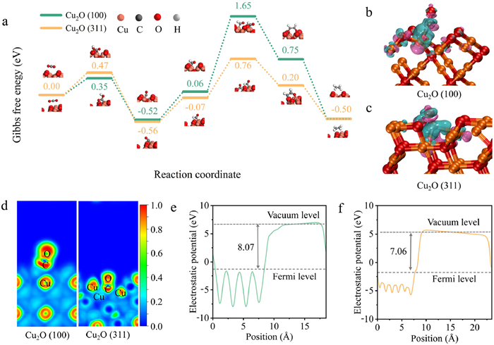 | Fig. 6. Mechanistic studies by DFT calculations. (a) The free energy diagrams for CO2 reduction to different intermediates on the Cu2O (100) and Cu2O (311) surfaces at U = 0 V. DCD map for the *CO intermediate adsorbed on the (b) Cu2O (100) and (c) Cu2O (311) surfaces. (d) ELF of Cu2O (100) and Cu2O (311). The WF across the (e) Cu2O (100) slab and (f) Cu2O (311) slab vacuum interface. | |