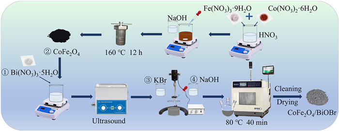 CoFe2O4/BiOBr was prepared using a microwave-assisted co-precipitation method (Fig. 1). 3 mmol of Bi(NO3)3·5H2O were dissolved in 45 mL of ethylene glycol, while 3 mmol of KBr were dissolved in 15 mL of ethylene glycol. A certain amount of CoFe2O4 was added to the Bi(NO3)3·5H2O solution and sonicated for 30 min, followed by mechanical stirring for 30 min. The KBr solution was then added dropwise to the mixture, and stirred for another 30 min. Finally, the pH of the solution was adjusted to 5 using 1 mol/L NaOH, the mixture was stirred for 1 h and then reacted under microwave assistance at room temperature and atmospheric pressure (Fig. S1 in Supporting information). The mixture was reacted at 80 ℃ for 40 min, then washed with anhydrous ethanol and deionized water for three times, followed by drying in a vacuum oven at 60 ℃.