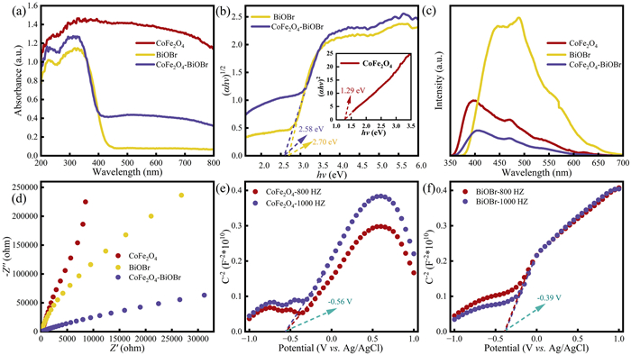 | Fig. 10. (a) UV–vis diffuse reflectance spectra, (b) Tauc plots, (c) photoluminescence spectra, and (d) Nyquist plots of CoFe2O4, BiOBr, and CoFe2O4/BiOBr. (e) Mott-Schottky plots of CoFe2O4 and (f) BiOBr. | |