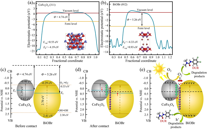 | Fig. 11. The work functions of (a) CoFe2O4 and (b) BiOBr. (c-e) The possible photodegradation mechanism of DUR with CoFe2O4/BiOBr as photocatalyst under visible light. | |