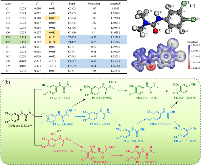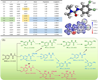 | Fig. 12. (a) The bond population, Fukui indices and electrostatic potential distribution of DUR. (b) Possible degradation pathway of DUR in CoFe2O4/BiOBr process. | |