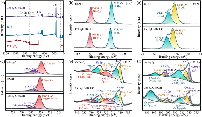 | Fig. 4. (a) XPS surveys, (b) Bi 4f, (c) Br 3d, (d) O 1s, (e) Fe 2p and (f) Co 2p peaks of BiOBr, CoFe2O4 and CoFe2O4/BiOBr. | |