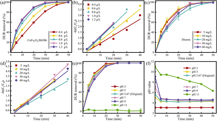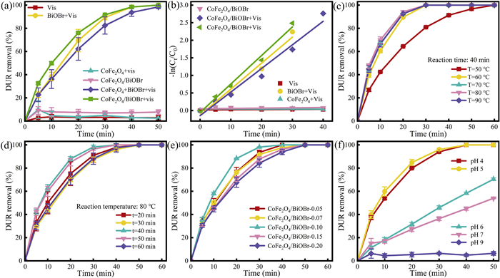 | Fig. 5. Under visible light irradiation, the effects of (a) different reaction systems on DUR removal rate and (b) pseudo-first-order kinetics were discussed. The effects of (c) synthesis temperature, (d) synthesis time, (e) CoFe2O4 addition amount and (f) synthesis pH on DUR removal rate were investigated. Operating conditions: DUR = 10 mg/L, catalyst = 1 g/L, room temperature. | |