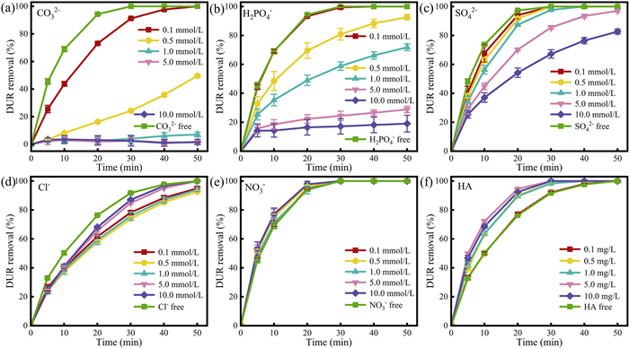 | Fig. 7. Effects of different concentrations of (a) CO32-, (b) H2PO4-, (c) SO42-, (d) Cl-, (e) NO3- and (f) HA on the degradation of DUR under visible light. Operating conditions: DUR = 10 g/L, catalyst = 1 g/L, room temperature. | |