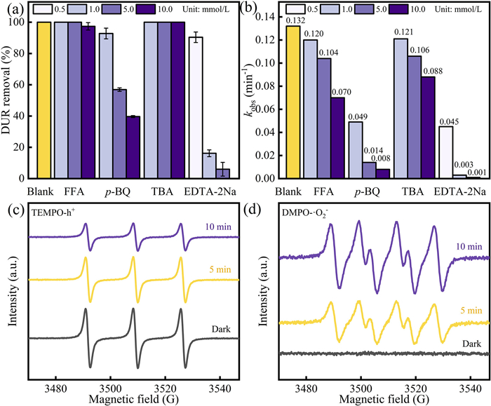 | Fig. 9. (a) Removal efficiency, (b) corresponding pseudo-first-order rate constant, (c) h+ and (d) •O2- EPR spectra in the dark, 5 and 10 min under different scavengers upon visible light irradiation. | |