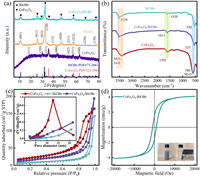 | Fig. 3. (a) XRD patterns of BiOBr, CoFe2O4 and CoFe2O4/BiOBr samples. (b) FTIR spectra. (c) N2 adsorption-desorption curve, pore size distribution curve (illustration). (d) Magnetic hysteresis loop. | |