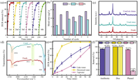 | Fig. 8. During the recycling process (a) the removal rate of DUR, (b) ion leaching, (c) XRD before and after use, and (d) FTIR before and after use. (e) Removal of DUR in different water bodies and (f) removal of different pollutants. | |