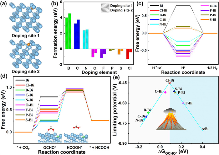 | Fig. 2. (a) Schematic diagram of doping sites of non-metallic elements on Bi, the blue and orange spheres represent Bi and non-metallic (including B, C, N, O, F, P, S, and Cl) atoms, respectively. (b) Calculated formation energy of non-metallic elements on different sites. (c) Free energy diagram of HER. (d) Free energy diagram of CO2RR from CO2 to HCOOH. (e) Volcano curve between limiting potential of CO2RR and the adsorption free energy of OCHO*. | |