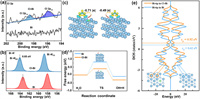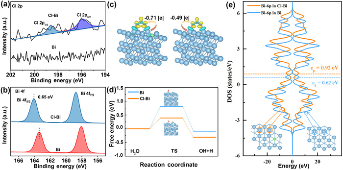 | Fig. 4. High-resolution XPS spectra of (a) Cl 2p and (b) Bi 4f for Bi and Cl-Bi catalysts. (c) Charge density difference map of OCHO on Bi (right) and Cl-Bi (left). The isovalue of the isosurfaces is 3.0 × 10−3 eÅ−3, and yellow (cyan) represents the charge accumulation (deletion). (d) Reaction energy barrier of H2O splitting on Bi and Cl-Bi. (e) Density of states of Bi-6p orbital and corresponding p-band center in Bi and Cl-Bi. | |