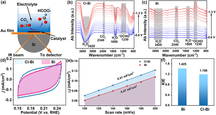 | Fig. 6. (a) Schematic diagram of in situ ATR-SEIRAS. In situ ATR-SEIRAS spectra of (b) Cl-Bi and (c) Bi at different potentials. (d) Cyclic voltammetry (CV) curves of the Cl-Bi and Bi at 200 mV/s. (e) Calculated ECSA value of Cl-Bi and Bi at various potentials. (f) KIE of Cl and Cl-Bi measured under −0.95 V vs. RHE. | |